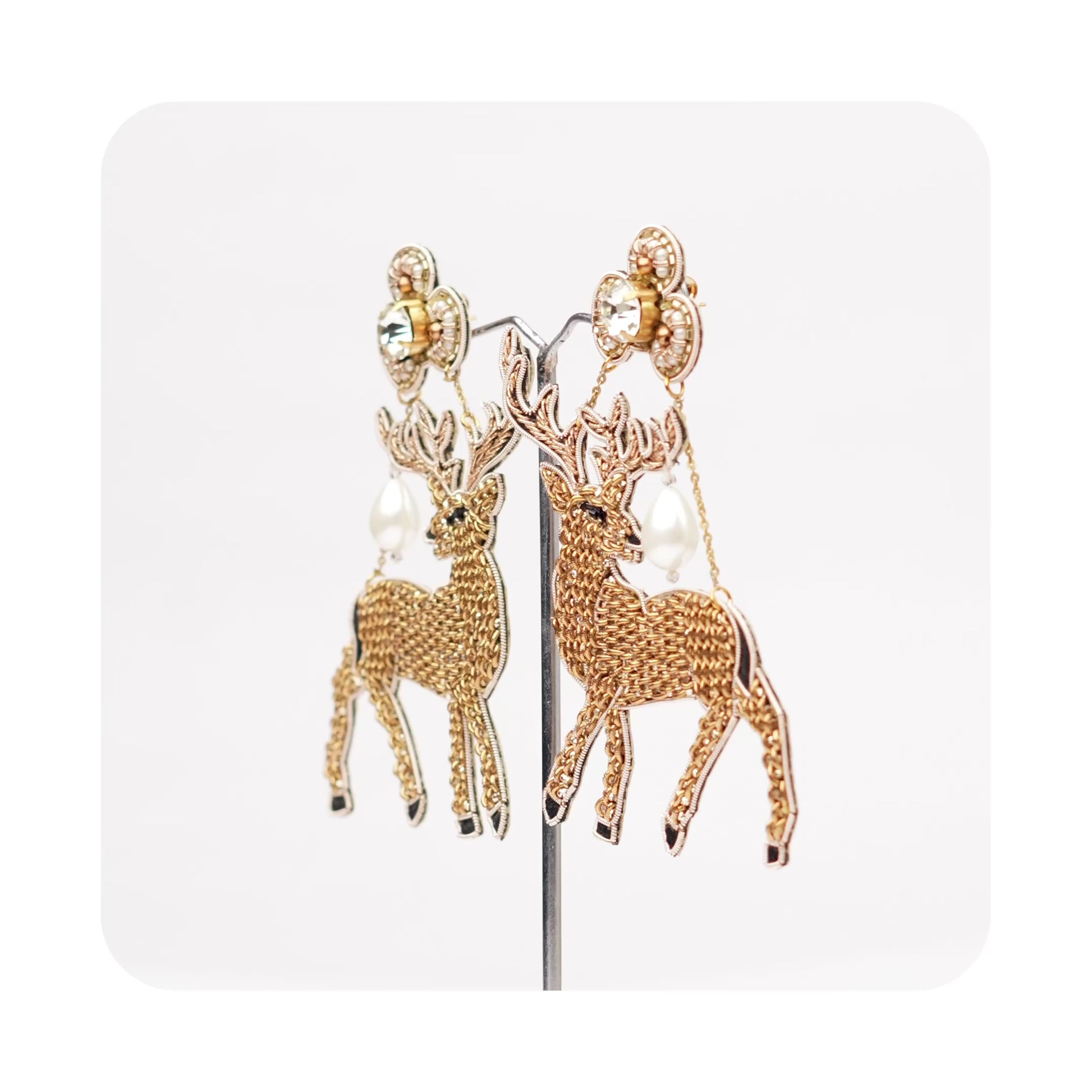 A graceful deer brought to life with a body embroidered in shimmering gold French wire, giving it a rich, textured look. The antlers are crafted with twisted dori for a bold, sculpted feel. Suspended from a delicate chain, this design adds elegance with a touch of the wild — light, detailed, and eye-catching.