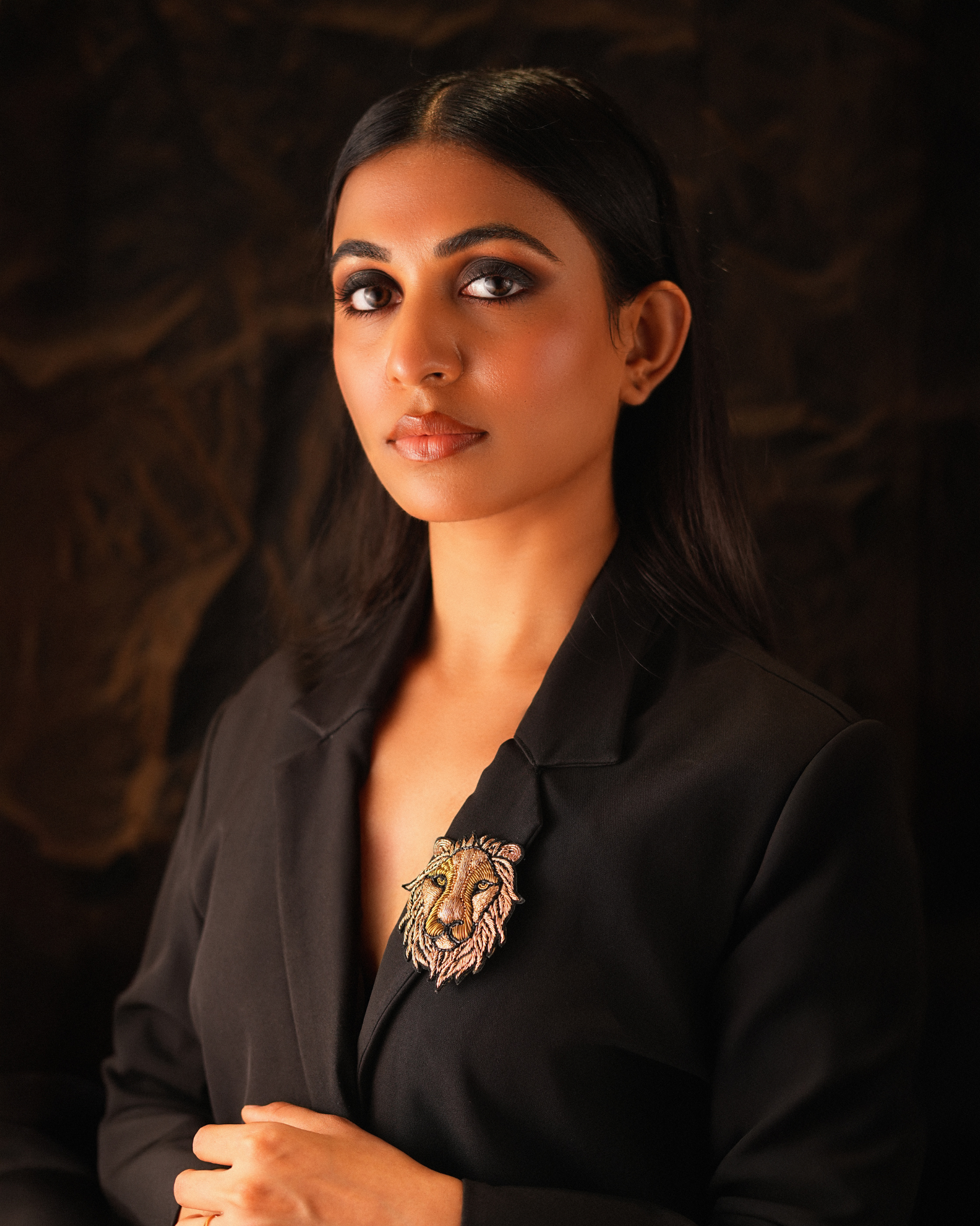 A bold tribute to strength and elegance, this lion brooch showcases a hand-embroidered face with piercing eyes and a rounded nose, radiating power with composure. The mane, crafted with twisted dori work, brings depth and movement, while every detail is layered with care. A statement piece that embodies fierceness, regality, and unforgettable charm.