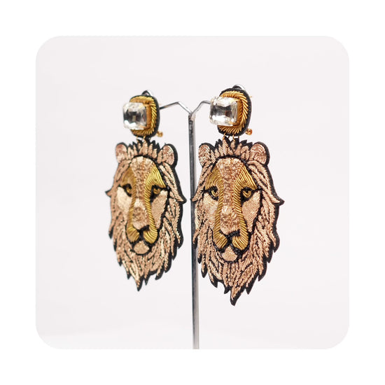 A bold tribute to strength and elegance, these lion earrings feature a hand-embroidered face with striking eyes and a rounded nose, giving it a powerful yet composed expression. The mane is crafted using twisted dori work, adding rich texture like movement. Every detail is thoughtfully layered to create a statement piece that roars with character — fierce, regal, and unforgettable.