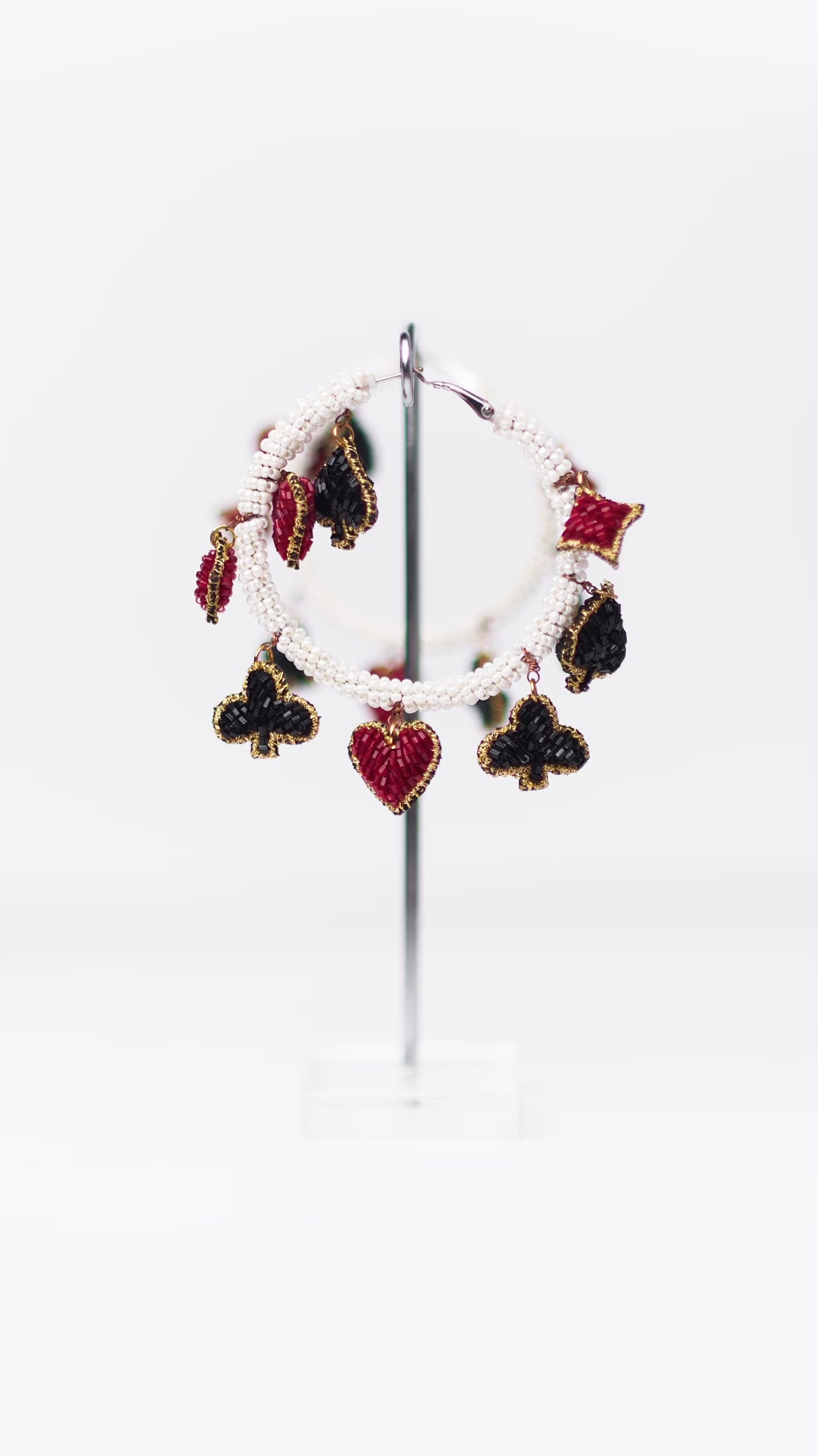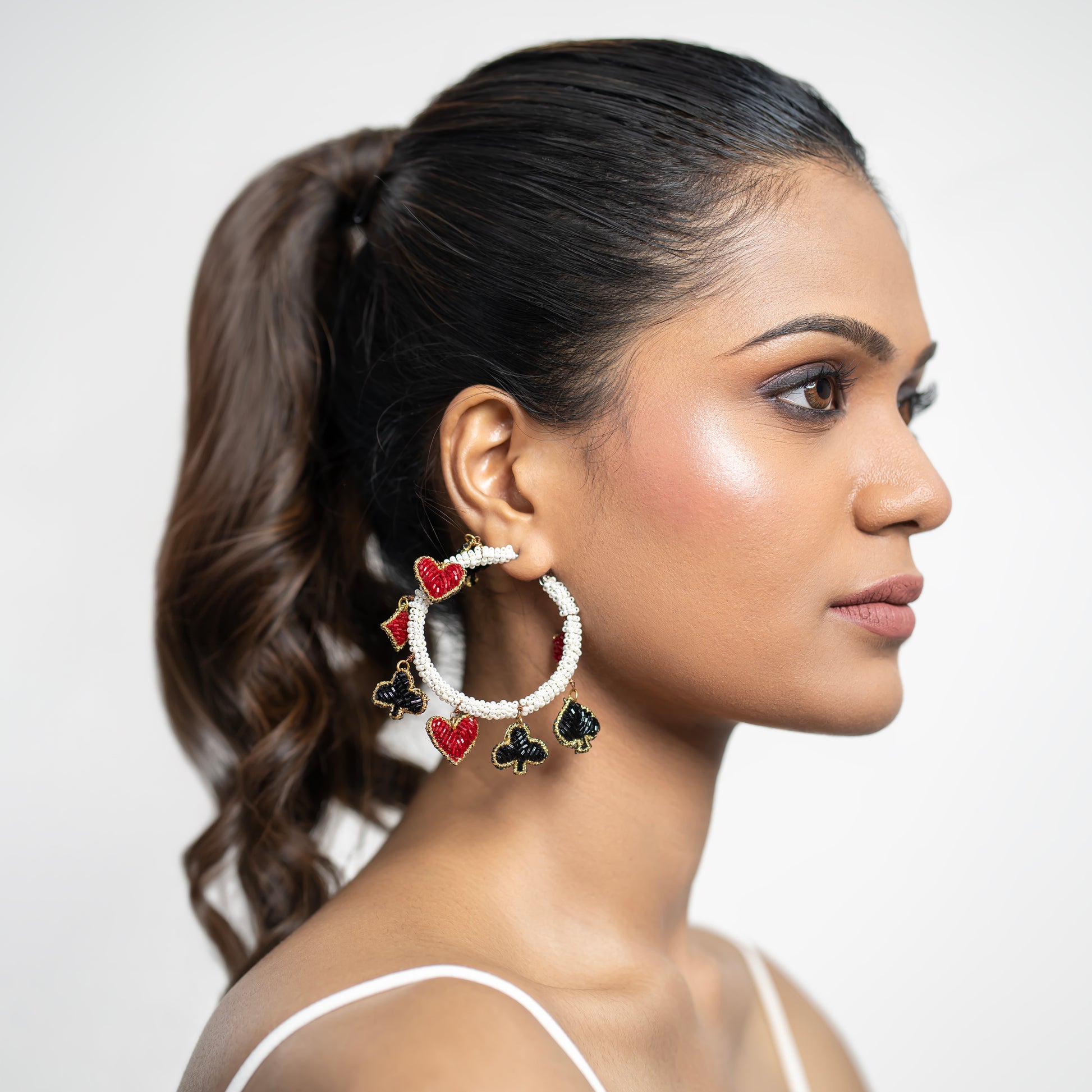 Step into whimsy with our Whimsical Card Suits Pearl Hoop Earrings, showcasing a playful yet elegant design. These hoops feature a wrap of small white pearls, with charming diamond, heart, spade, and club suits charms dangling gracefully. Perfect for those who appreciate unique and stylish accessories.