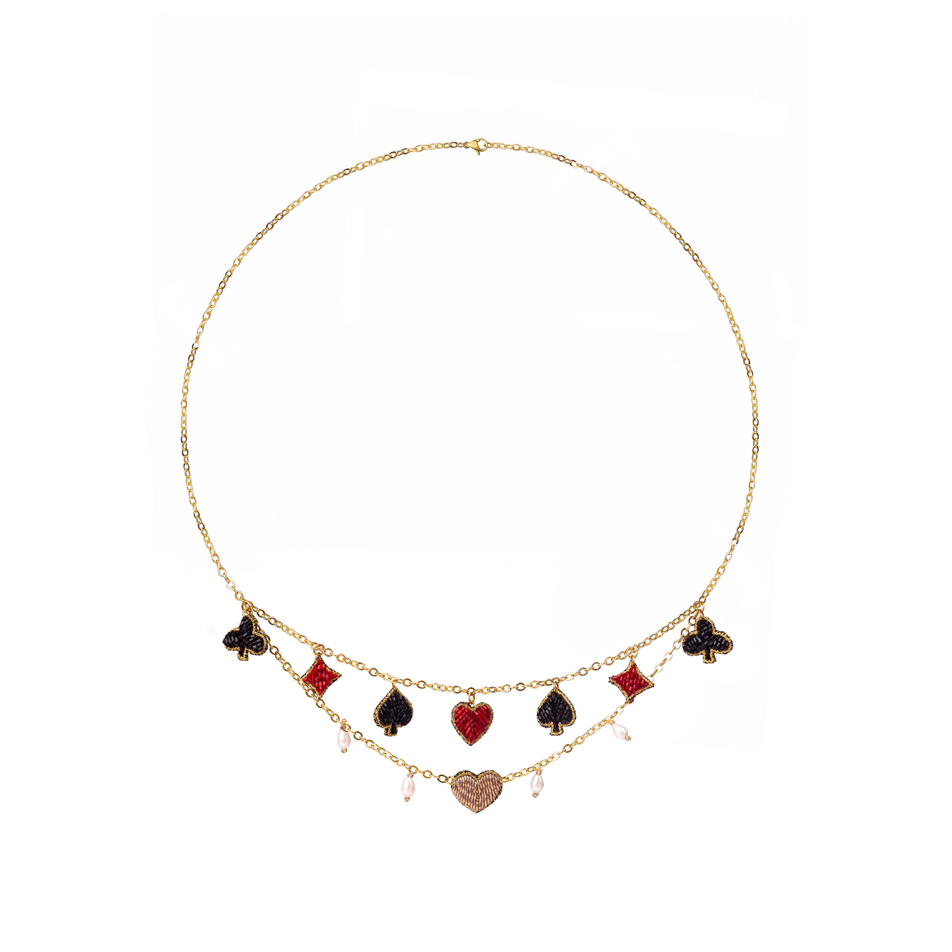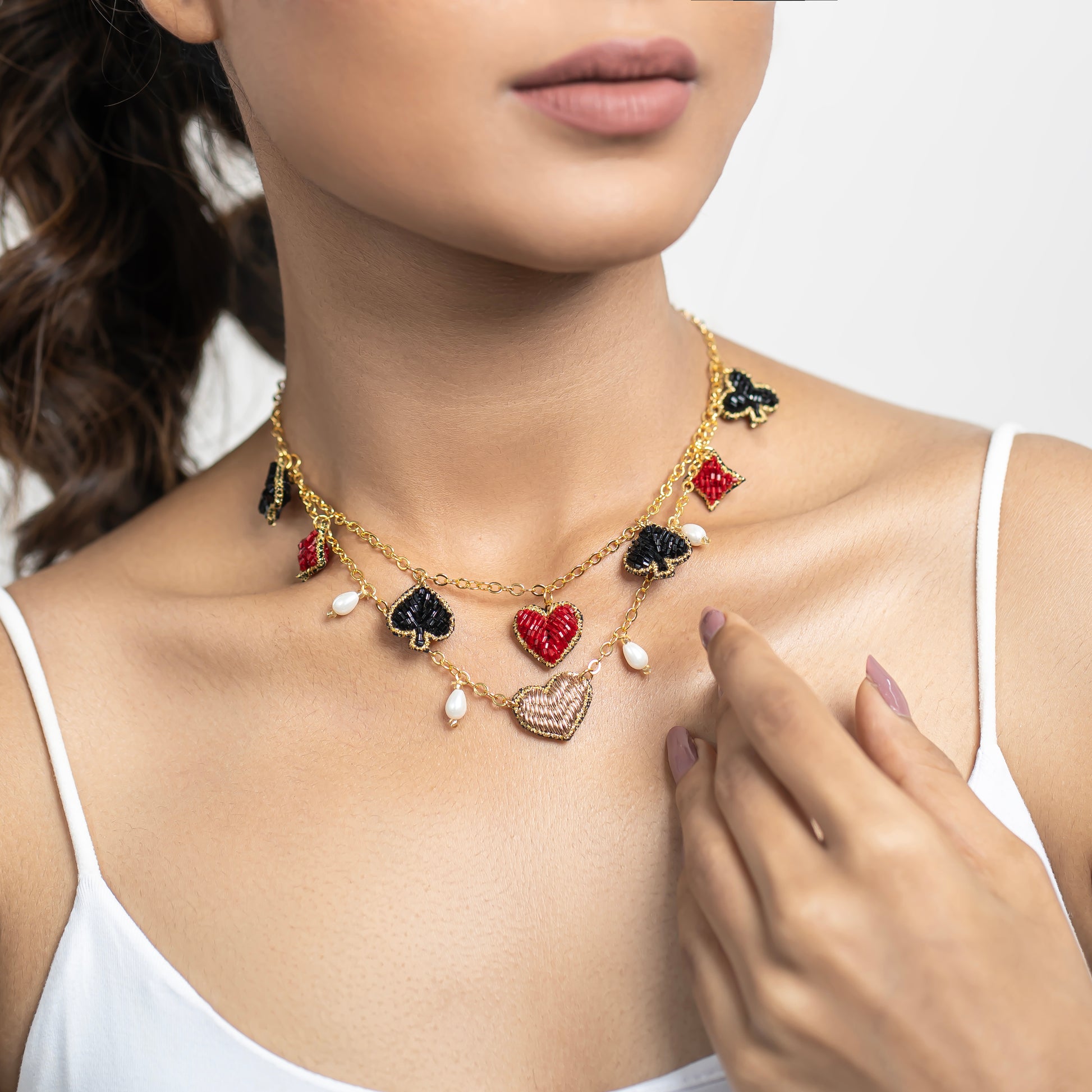 Chain adorned with diamond, heart, spade, and club suits charms, enhanced with subtle pearl details. Perfect for those who appreciate a blend of elegance and charm.