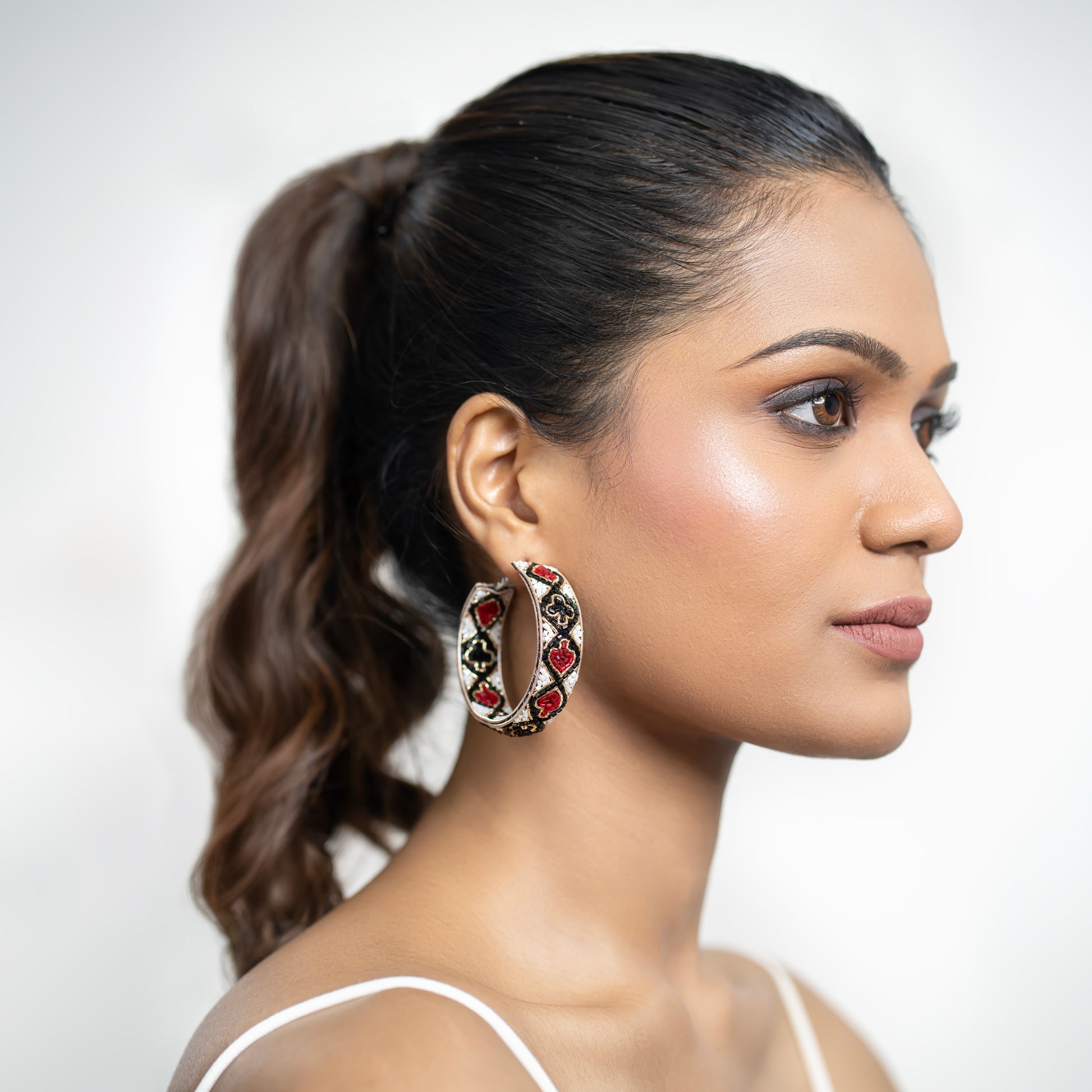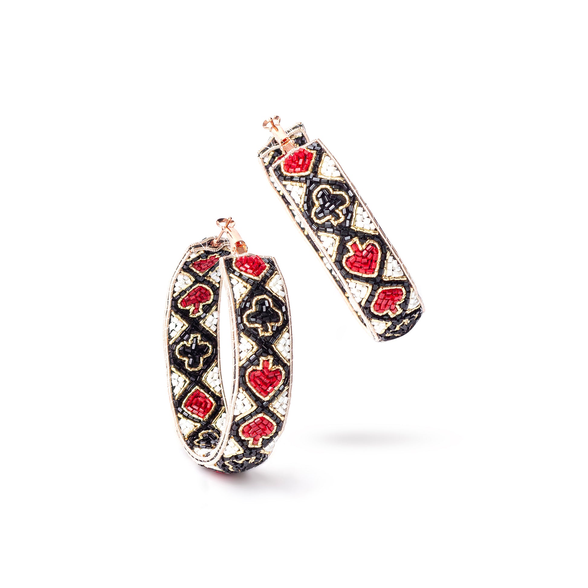 Step into sophistication with our Chic Card Suits Pattern Hoop Earrings, featuring diamond, heart, spade, and club suits, making them a versatile and elegant addition to your jewelry collection.